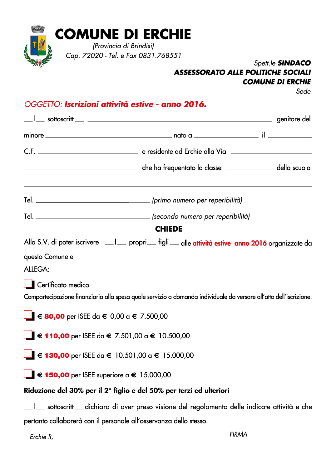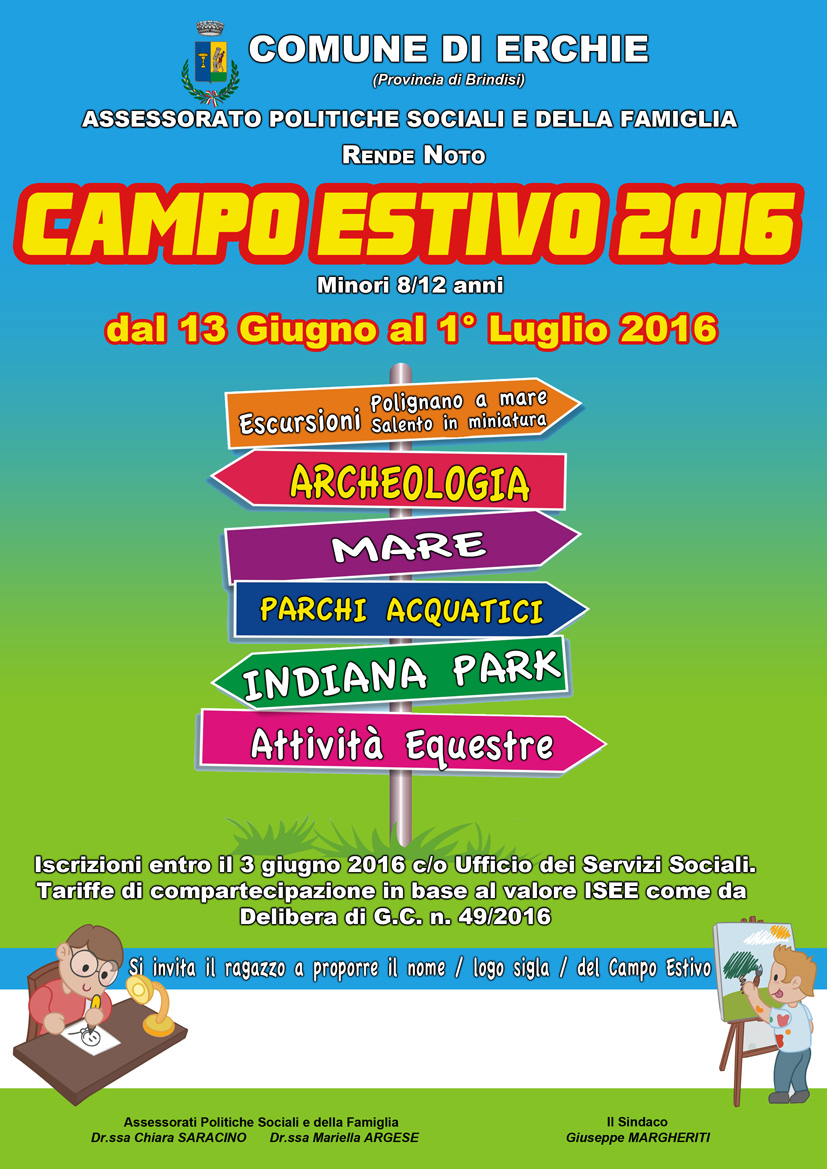 25 Maggio 2016 CAMPO ESTIVO 2016 HomeNotizieCAMPO ESTIVO 2016 SONO APERTE LE ISCRIZIONI PER LE ATTIVITA’ ESTIVE MANIFESTO MODULO D’ISCRIZIONE