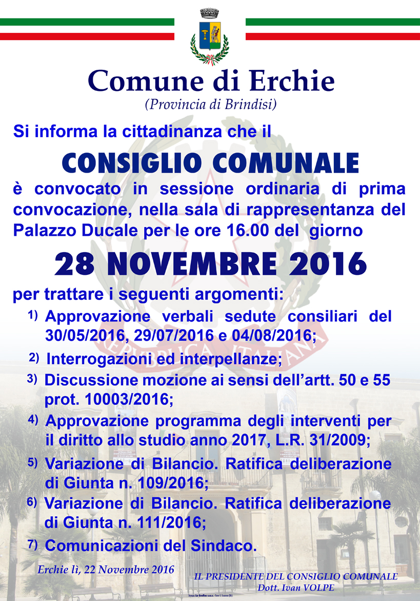 Si comunica che il Consiglio Comunale è convocato in sessione ordinaria di prima convocazione per il giorno del 28 Novembre a.c. alle ore 16.00 nella consueta sala di rappresentanza.