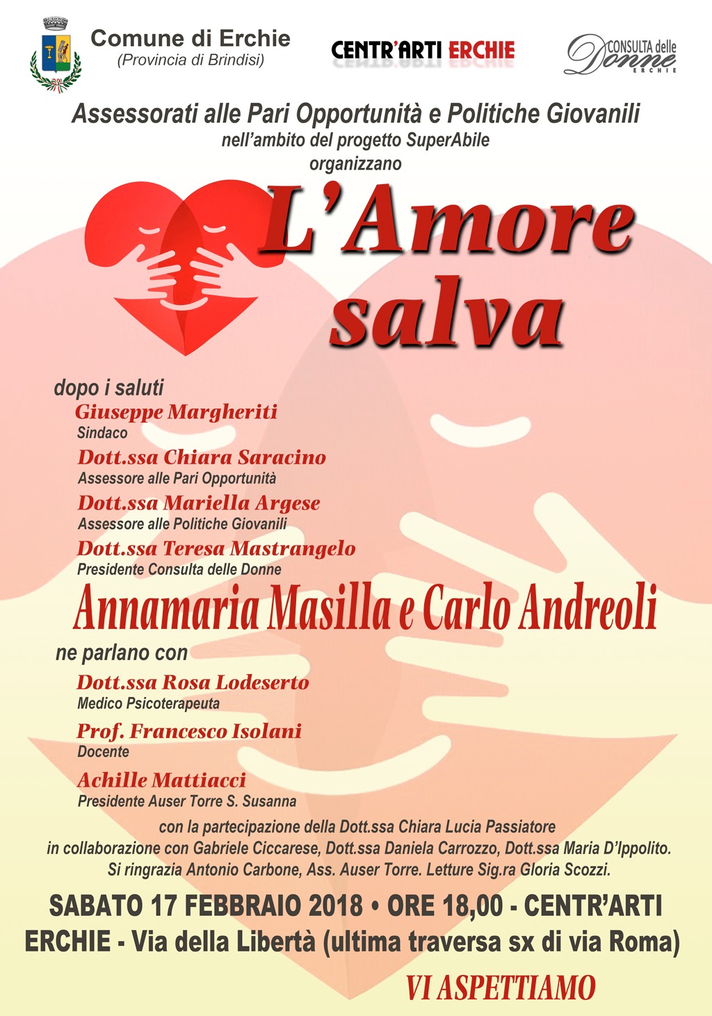 9 Febbraio 2018 EVENTO – L’AMORE SALVA HomeNotizieEVENTO – L’AMORE SALVA SABATO 17 FEBBRAIO 2018 – ORE 18,00 – CENTR’ARTI “L’AMORE SALVA” MANIFESTO EVENTO