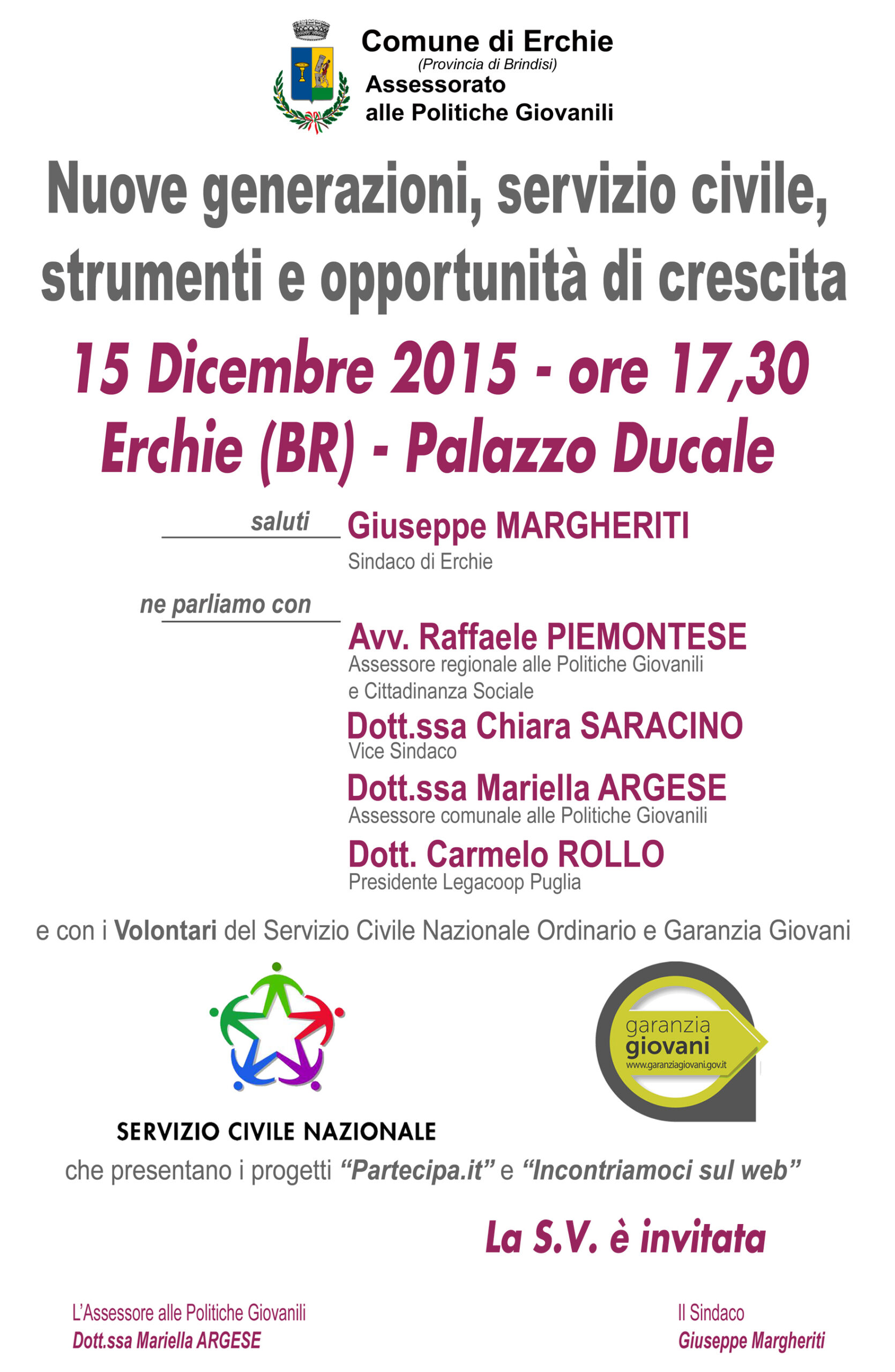 Martedì 15 Dicembre alle ore 17:30,presso il Palazzo Ducale, i volontari del Servizio Civile presenteranno i loro progetti davanti all’ Assessore Regionale alle Politiche Giovanili e Cittadinanza Sociale Raffaele PIEMONTESE.